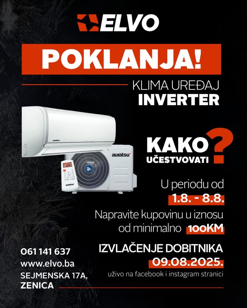 U periodu od 1. do 8. augusta 2025. godine, svi koji obave kupovinu u minimalnom iznosu od 100,00 KM automatski učestvuju u nagradnoj igri i imaju priliku osvojiti klima uređaj – inverter marke AURATSU! ❄️☀️