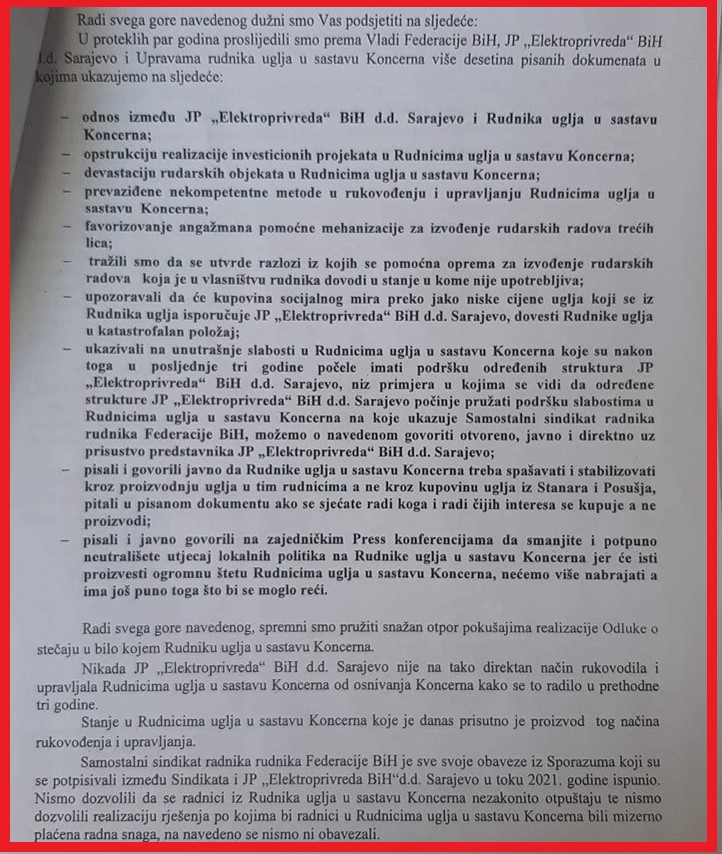 – Ako je cilj JP Elektroprivreda da Rudnike uglja u sastavu Koncerna koji su joj u ogromnoj mjeri pružili bogatstvo uvodi u stečajne postupke te da u istim omogući ekspolataciju uglja određenim moćnicima koji su razvili i razvijaju svoje komapnije novcem iz Rudnika uglja u Federaciji BiH tada je socijalni bunt radnika iz oblasti rudarstva u Federaciji BiH neizbježan i neminovan, naveli su iz Sindikata.