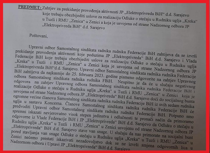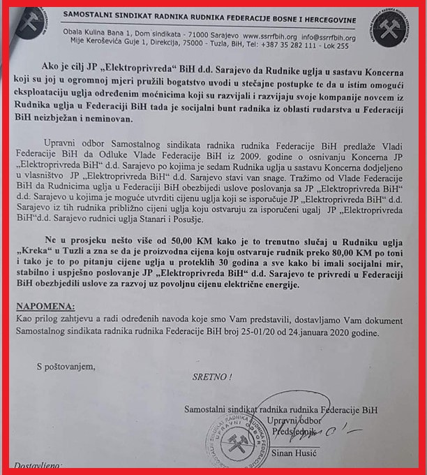 Proteklih nekoliko dana Sindikat je uputio Vladi FBiH i JP Elektroprivreda BiH zahtjev za prekidanje provođenja aktivnosti za realizaciju Odluke o stečaju Rudnika uglja Kreka i RMU Zenica. Ukoliko ne udovolje ovom zahtjevu iz Sindikata kažu da će ponovo vidjeti jedinstvo rudara te najavljuju proteste.