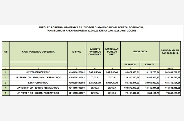 Porezna uprava Federacije BiH podatke o najvećim dužnicima objavljuje svaka tri mjeseca. Sljedeći pregled će biti objavljen 30. septembra.