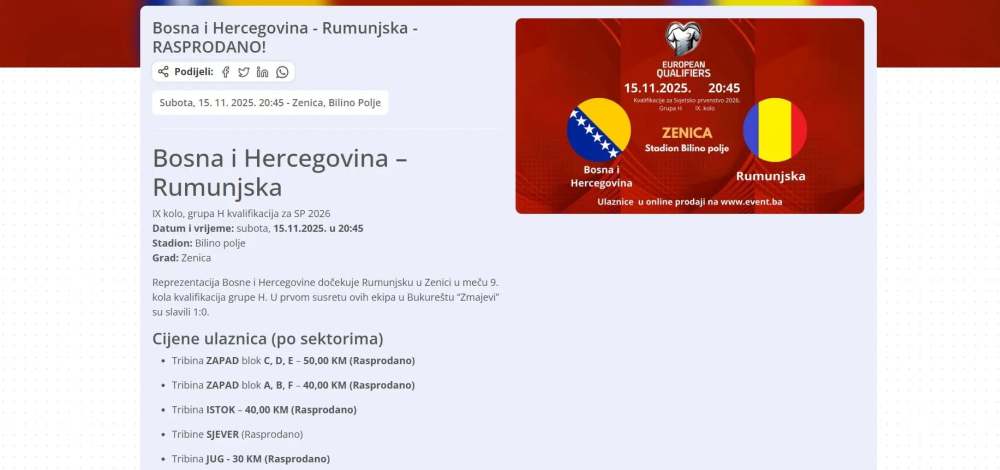 Objavljeno je to na platformi Evant.ba koja se bavi prodajom ulaznica.
