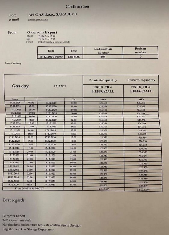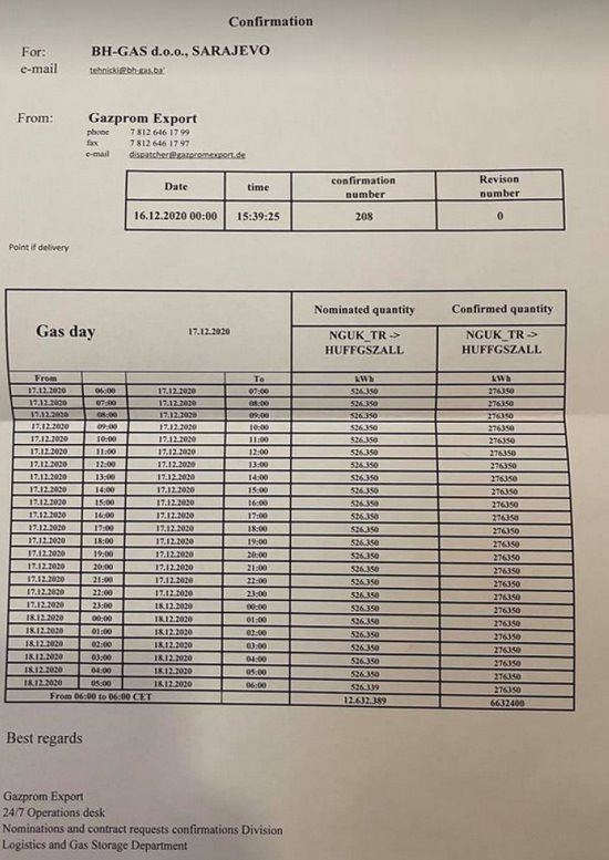 Tačno je da je BH-Gas dana 16.12.2020. godine u 12 sati 16 minuta i 36 sekundi dobio potvrdu o odobrenju potrebih količina prirodnog gasa za Energoinvest/BH-Gas.