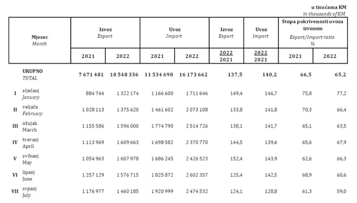 U razdoblju od sedam mjeseci 2022. godine izvoz iz Bosne i Hercegovine iznosio je 10 milijardi 548 miliona KM što je za 37,5 posto više u odnosu na isti period prošle godine.
