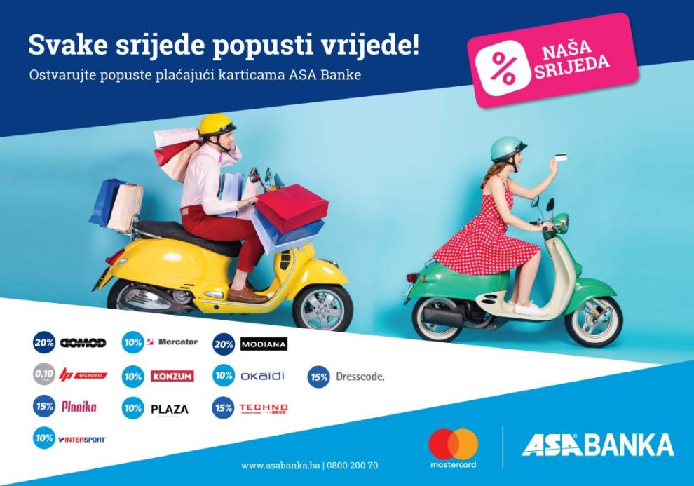 “Naš cilj je klijentima omogućiti pristupačno i jednostavno bankarsko poslovanje, te im olakšati svakodnevni život kroz olakšice i povoljnosti prilikom kupovine, planiranja putovanja i u konačnici dugoročnog ulaganja. Drago nam je da nastavljamo sa programom lojalnosti Naša srijeda koji je već prepoznat od strane klijenata kao dan kada se planira povoljna kupovina. Svake srijede plaćajući karticama ASA Banke, klijenti ostvaruju popuste u Domodu, Mercatoru, Modiani, Tehno Shop web shop-u, Hifa petrol pumpama, Konzumu, Okaidi, Planika, Plaza i Intersport prodavnicama, a novitet od ove godine je Dresscode koji u okviru Naše srijede nudi do 15% popusta na kompletan asortiman putem web shop-a.” – ističu iz ASA Banke, te dodaju kako je kroz ovaj program cilj klijentima pružiti dodatnu vrijednost koju mogu ostvariti kroz popust i do 20% u navedenim trgovinama.
