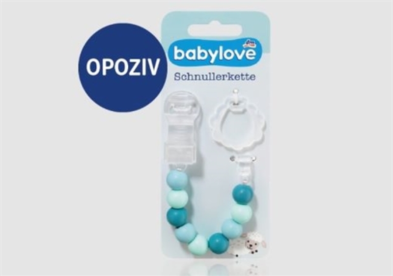 Agencija za nadzor nad tržištem Bosne i Hercegovine povukla je iz prodaje “babylove” silikonski lančić za cuclu jer predstavlja rizik od gušenja zbog mogućnosti da se sa kuke za pričvršćivanje cucle odvoje sitni dijelovi plastičnog materijala od kojeg je napravljena.