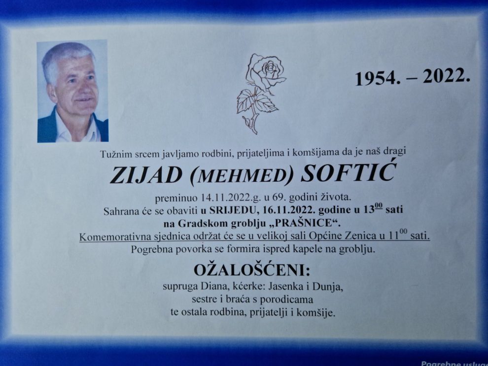 U ponedjeljak, 14. novembra, u Zenici preminuo je Zijad Softić, dugogodišnji društveni, kulturni i javni radnik. Rođen je u Zenici 1954. godine, školovao se u Zenici i Sarajevu, gdje je završio Fakultet političkih nauka, odsjek Politologija. Radni angažman je počeo u Našoj riječi, potom je bio izvrsni sekretar Komiteta, zaposlen u RMU Zenica te profesor u srednjoj školi. Od 1998. godine na radnom je angažmanu u Općini Zenica. Od 2008. je bio na funkciji pomoćnika načelnika za društvene djelatnosti kao i pomoćnika gradonačelnika za istu oblast, što je obavljao do 2019. godine kada je otišao u penziju, objavila je Naša riječ dijelove njegove biografije.