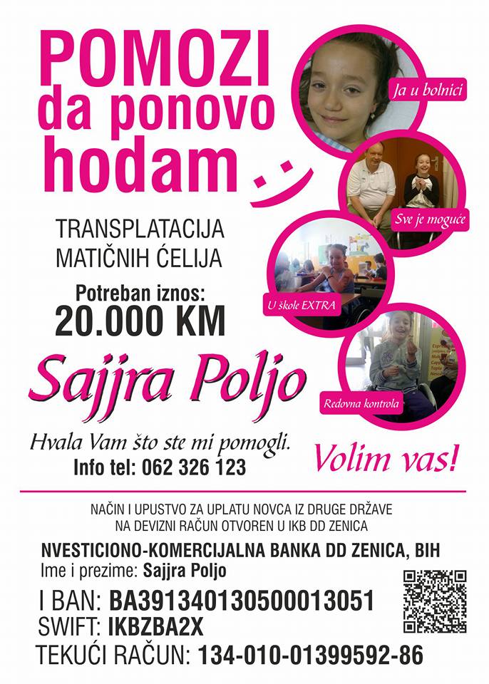Bez vaše pomoći do sad Sajjra ne bi uspjela ni dobiti šansu, uz vašu pomoć koja joj je sad najpotrebnija nadamo se da možemo skupiti 10.000 eura koliko košta transplatacija matičnih ćelija. Molimo vas dobre ljude da joj pomognete, barem dijeljenjem ovog posta.