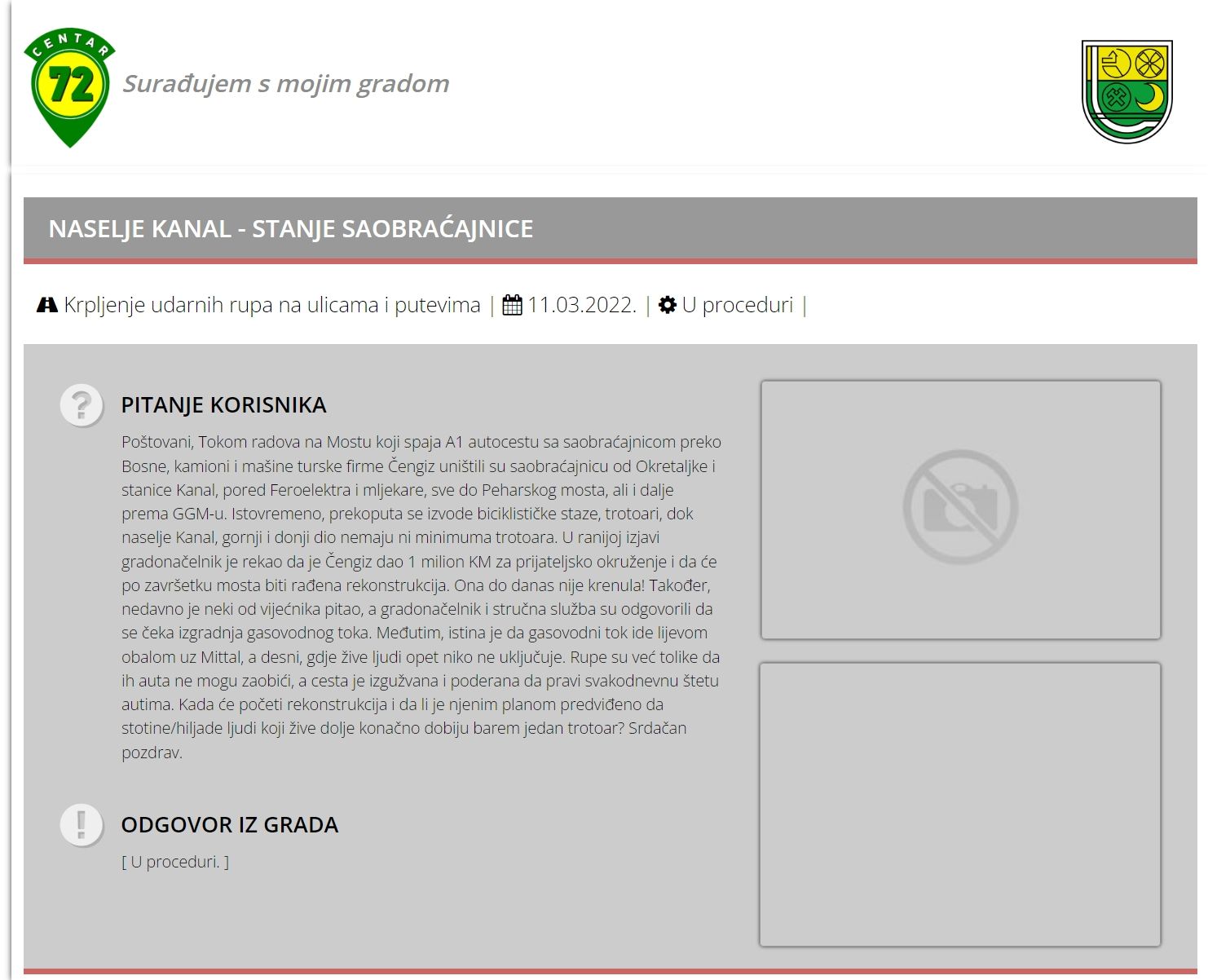 Na stranici Centar72 našli smo jedno od obraćanja Gradskoj upravi. Iako je na naslovnici ovog komunalnog servisa navedeno da se “odgovori daju u roku tri radna dana”, primjećujemod a je na ovo pitanje odgovor “u proceduri” više od mjesec dana. Izgleda da nadležni u Gradu zenica nemaju nikakav odgovor za hiljade građana i stotine registrovanih vozila na potezu Pehare – Kanal – Donja Gračanica. U nastavku prenosimo tekst sa stranice Centar72.ba