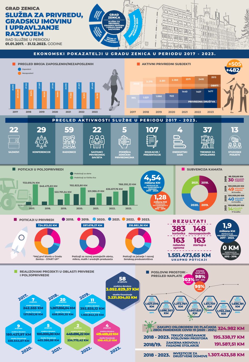 Grad Zenica kroz rad Službe za privredu, gradsku imovinu i upravljanje razvojem postigao je zavidne rezultate u razdoblju od 2017. do 2023. godine, čime je značajno unaprijedio privredni razvoj i poboljšao ekonomske pokazatelje. Ulaganjem u brojne projekte, Zenica je osigurala podršku razvoju privrede i poljoprivrede, dok su rezultati jasno vidljivi u povećanju broja zaposlenih, smanjenju nezaposlenosti i rastu aktivnih privrednih subjekata.