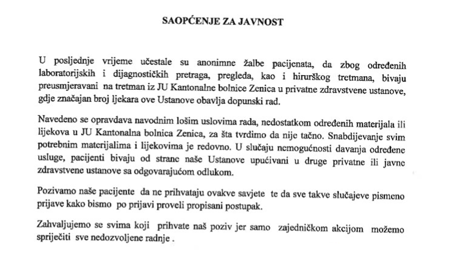Saopćenje iz KBZ o anonimnim žalbama pacijenata: