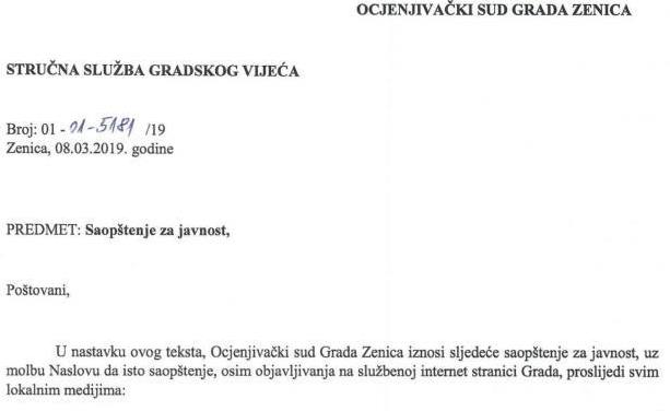 U nastavku ovog teksta, Ocjenjivački sud Grada Zenica iznosi sljedeće saopštenje za javnost, uz molbu Naslovu da isto saopštenje, osim objavljivanja na službenoj internet stranici Grada, proslijedi svim lokalnim medijima: