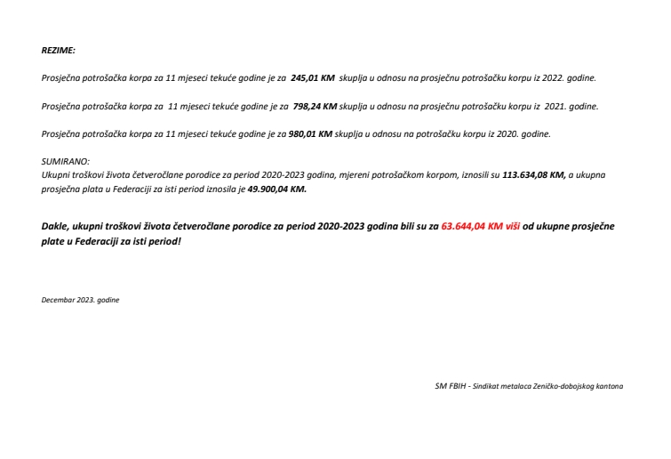 Zenica, 18.12.2023. g. SM FBIH – Sindikat metalaca ZDK