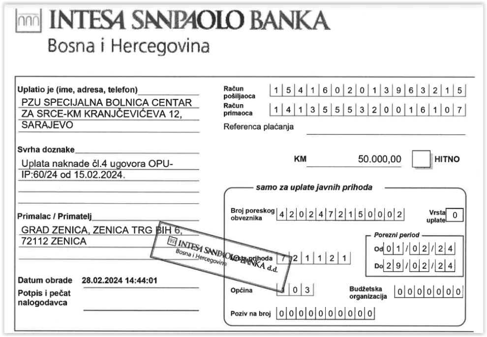 Dio zeničke javnosti dezavuisao je građane svojim skepticizmom, sugerirajući da do realizacije ovog značajnog projekta neće doći. Stoga želimo ovoga puta obavijestiti sve naše sugrađane činjenicom da je danas investitor i nosilac prava građenja, PZU Specijalna bolnica “Centar za srce – KM”, izvršio uplatu naknade od 50.000,00 KM po ugovoru na račun Grada Zenica. Ovaj čin predstavlja i jasan dokaz da Grad Zenica neće ulagati svoja sredstva za izgradnju klinike, već naprotiv, budžet Grada će dobiti i nešto novca, pored svih benefita koje će pomenuta klinika donijeti građanima.