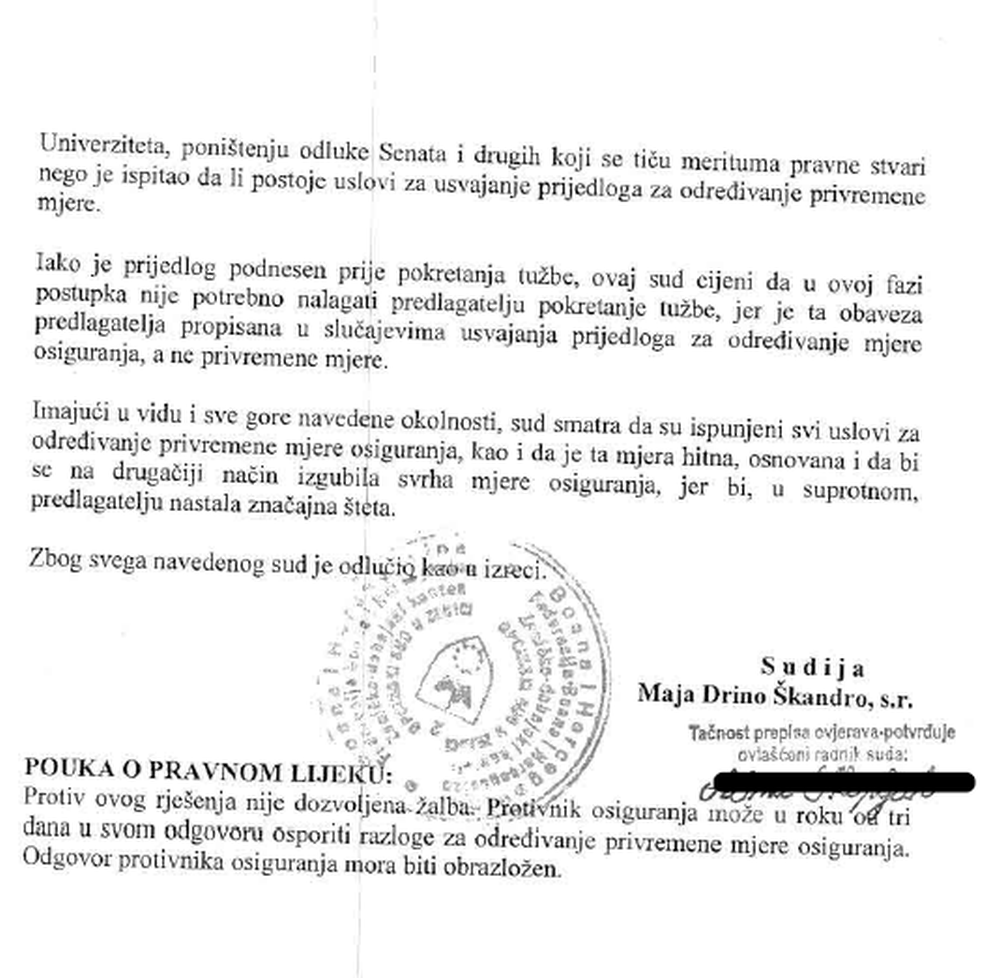 Univerzitet izražava zadovoljstvo zbog brzog djelovanja suda u cilju zaštite prava zaposlenih i normalnog funkcionisanja javne ustanove. Očekujemo da sve nadležne institucije odmah postupe u skladu sa ovom mjerom, te time spriječe dalje narušavanje prava zaposlenih i akademskih sloboda.