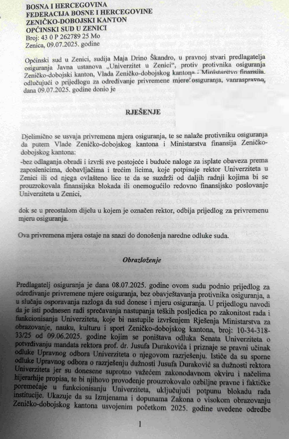 Općinski sud u Zenici donio je privremenu mjeru kojom se nalaže hitna isplata plata zaposlenicima Univerziteta u Zenici, bez ikakvog odlaganja i uslovljavanja. Odlukom suda je nedvosmisleno potvrđeno da je rektor prof.dr. Jusuf Duraković zakonski zastupnik Univerziteta i jedini ovlašteni potpisnik svih akata.