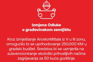 1. Izmjena Odluke o gradevinskom zemljištu – Kroz izmještanje ArcelorMittala iz V u III zonu, omogućilo bi se uprihodovanje 250.000 KM u gradski budžet. Sredstva bi se usmjerila na subvencioniranje ekološki prihvatljivih načina zagrijavanja za 50 kuća godišnje.