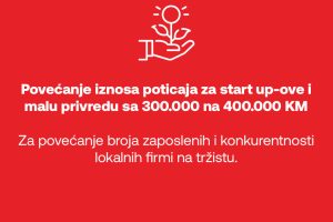 14. Povećanje iznosa poticaja za start up-ove i malu privredu sa 300.000 KM na 400.000 KM – Za povećanje broja zaposlenih i konkurentnosti lokalnih firmi na tržistu.