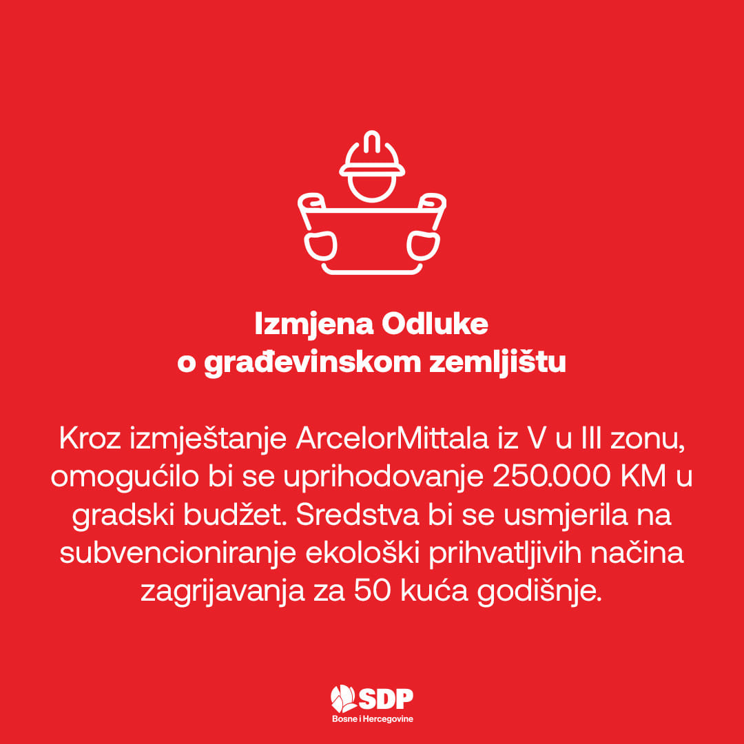 1. Izmjena Odluke o gradevinskom zemljištu – Kroz izmještanje ArcelorMittala iz V u III zonu, omogućilo bi se uprihodovanje 250.000 KM u gradski budžet. Sredstva bi se usmjerila na subvencioniranje ekološki prihvatljivih načina zagrijavanja za 50 kuća godišnje.