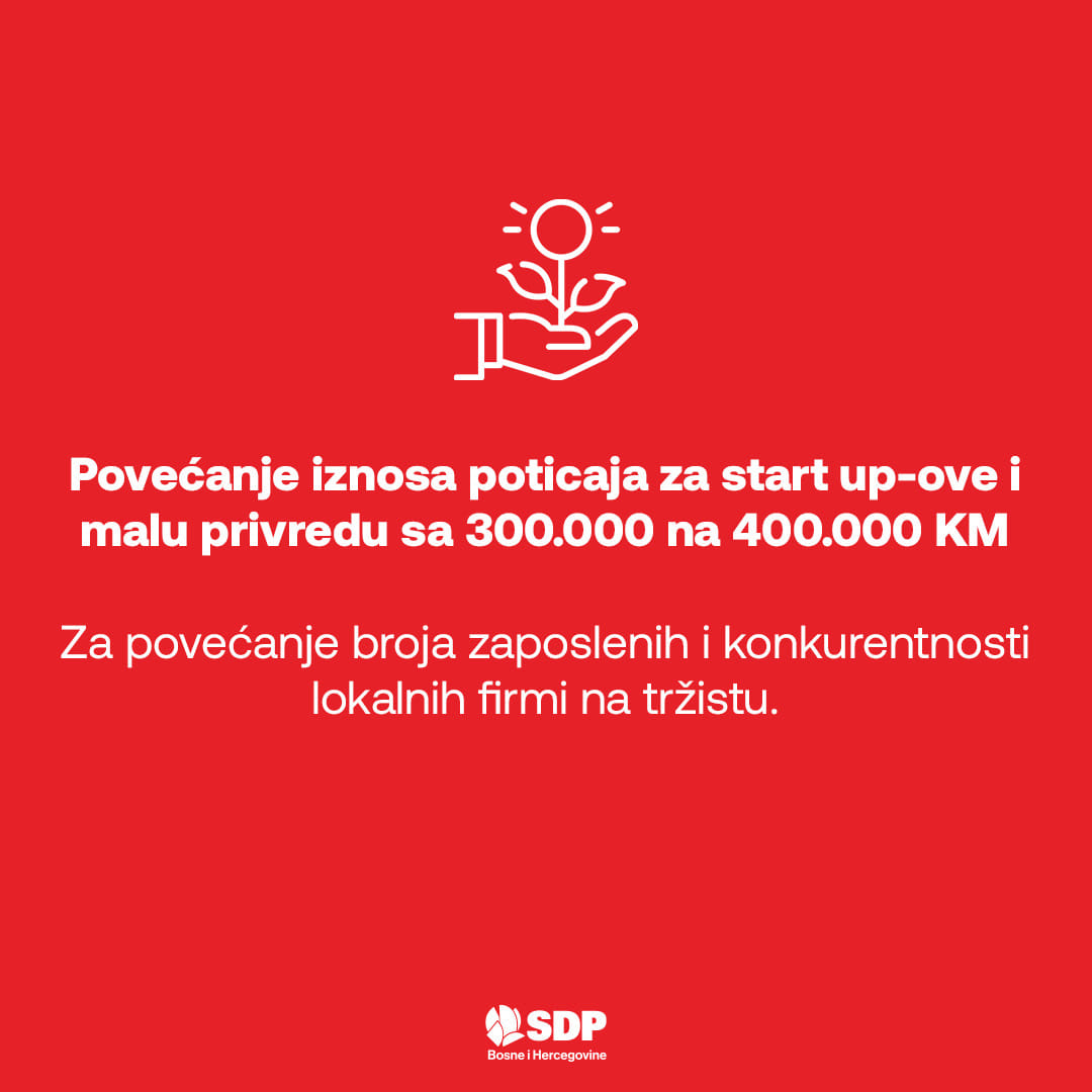 14. Povećanje iznosa poticaja za start up-ove i malu privredu sa 300.000 KM na 400.000 KM – Za povećanje broja zaposlenih i konkurentnosti lokalnih firmi na tržistu.
