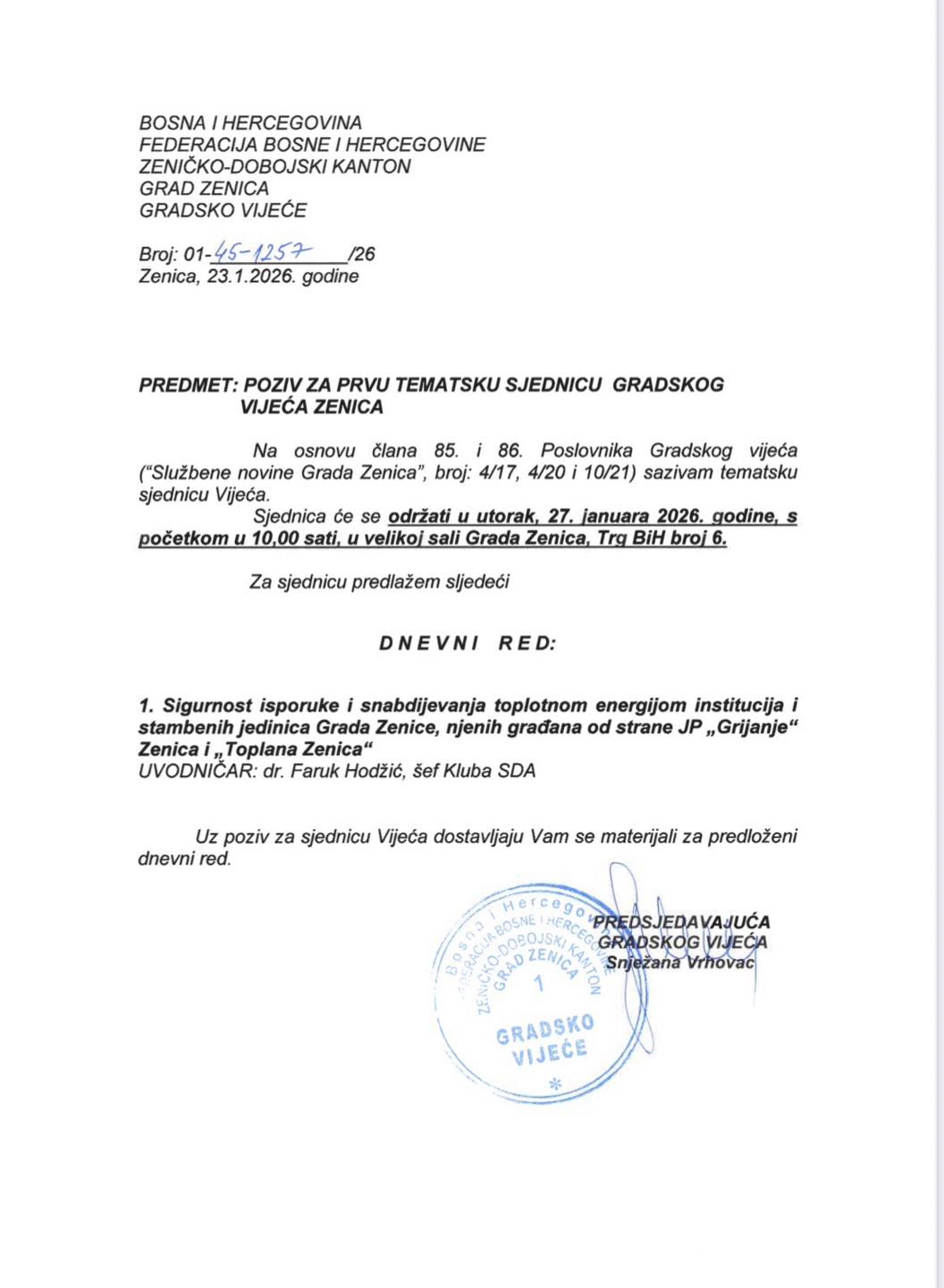 Nakon višednevnog pritiska javnosti, ali i zbog jasnih zakonskih obaveza, predsjedavajuća Gradskog vijeća Zenica sazvala je tematsku sjednicu o pitanju grijanja u gradu. Napominjemo da odgovore na pitanja o lošem grijanju u Zenici, postavljena na prethodnoj tematskoj sjednici o istoj temi, nikada nismo dobili.