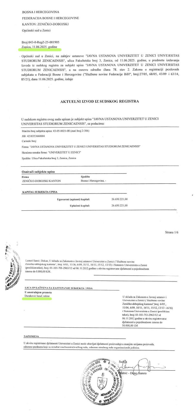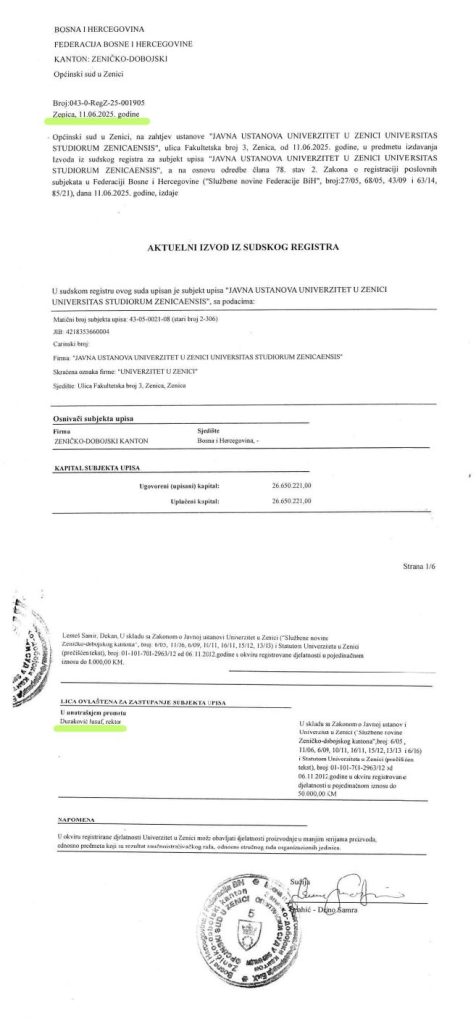 Nadležni općinski sud odbio je zahtjev Upravnog odbora za brisanje rektora iz sudskog registra, čime je potvrđeno da su pokušaji njegove smjene pravno neutemeljeni i pravosnažno odbijeni. Dana 11. juna 2025. godine Univerzitet u Zenici je dobio važeći izvod iz sudskog registra u kojem se jasno navodi da prof. dr. Jusuf Duraković zastupa Univerzitet u Zenici kao zakoniti rektor i jedini ovlašteni pravni zastupnik (Prilog: Aktuelni iuvod iz sudskog registra).
