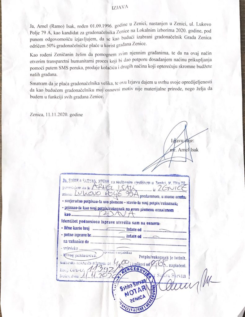 Saopćenje za javnost A-SDA Zenica: Pola plaće u korist građana – Koliko je uvjeren u svoju pobjedu nakon predizborne kampanje, budući gradonačelnik Zenice, Arnel Isak, danas je javnost informisao da će se dolaskom na novo radno mjesto odmah odreći 50 posto plaće u korist građana Zenice.