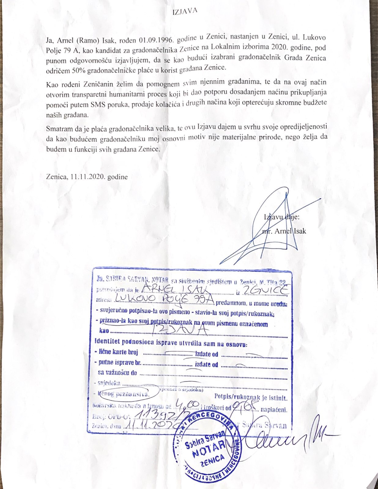 Ovjerena izjava kod notara i potez koji građani Zenice ne pamte u proteklih 20-tak godina naišli su na pozitivne reakcije javnosti s obzirom da je Arnel Isak mladi Zeničanin koji je u protekle dvije godine kao ministar u Vladi Zeničko-dobojskog kantona napravio velike rezultate. O svojoj predanosti funkciji gradonačelnika Zenice koji će biti na raspolaganju samo građanima govori i činjenica da mladi Isak interes građana stavlja ispred vlastitog, te sa funkcije ministra dolazi na funkciju gradonačelnika s koje se već sada odrekao 50 posto plaće.