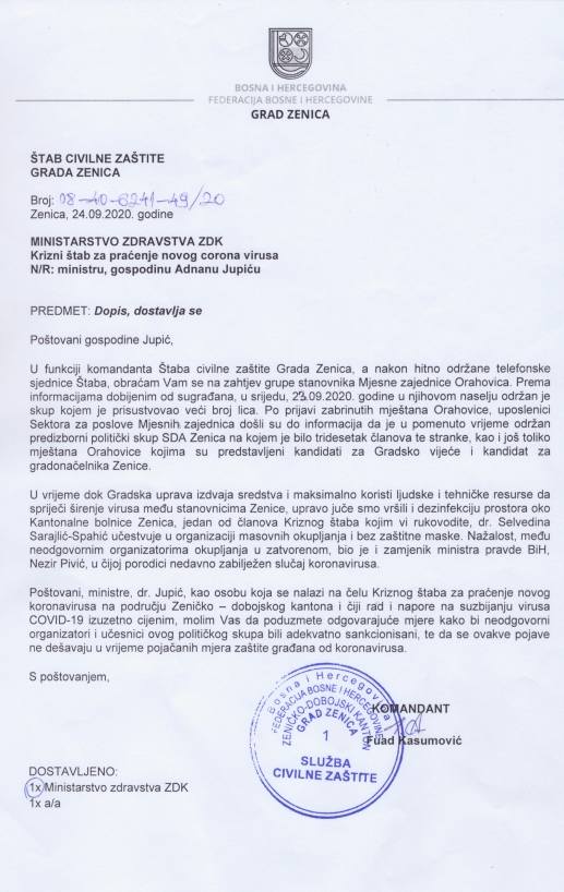 Saopćenje za javnost: Gradonačelnik Kasumović uputio dopis ministru zdravstva – Gradonačelnik Zenice Fuad Kasumović u svojstvu komandanta Štaba civilne zaštite Grada Zenica uputio je danas dopis Kriznom štabu za praćenje novog korona virusa koji djeluje pri Ministarstvu zdravstva Zeničko-dobojskog kantona u kojem se navodi da je putem Sektora za poslove mjesnih zajednica Grada Zenica obaviješten kako je u Mjesnoj zajednici Orahovica od strane mještana te mjesne zajednice uočeno kršenje mjera donesenih radi sprječavanja širenja zaraze korona virusom te se od resornog ministra traži poduzimanje aktivnosti kako se kršenje donesenih mjera ne bi više ponavljalo.