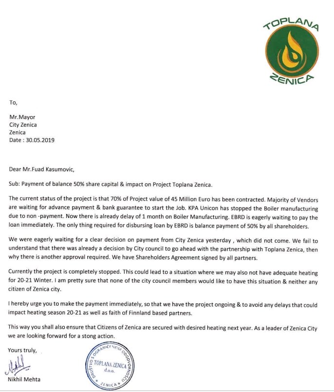 Saopćenje za javnost Gradske uprave Zenica – Dopis Toplana d.o.o. Zenica – Generalni direktor joint- venture kompanije “Toplana” d.o.o. Zenica, Nikhil Mehta uputio je u četvrtak, 30. maja 2019. godine dopis gradonačelniku Zenice, Fuadu Kasumoviću, s ciljem informisanja o posljedicama za projekat Toplana Zenica, odluke novoformirane većine u Gradskom vijeću Zenica, da na 37. sjednici održanoj u srijedu, 29. maja, ne usvoji Izvještaj o izvršenju Budžeta Grada Zenica za 2018. godinu i rasporedu viška prihoda.