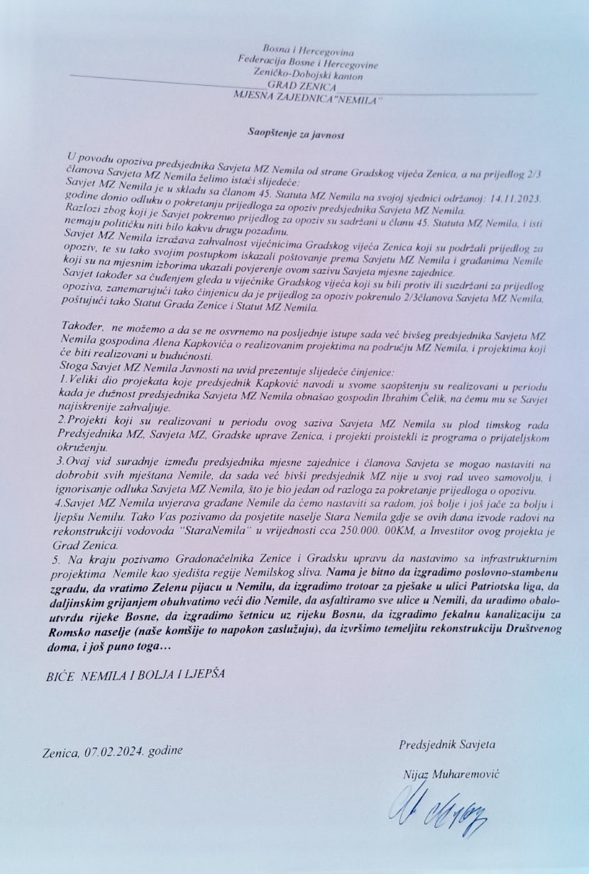 U povodu opoziva predsjednika Savjeta MZ Nemila od strane Gradskog vijeća Zenica, a na prijedlog 2/3 članova Savjeta MZ Nemila želimo istaći slijedeće: