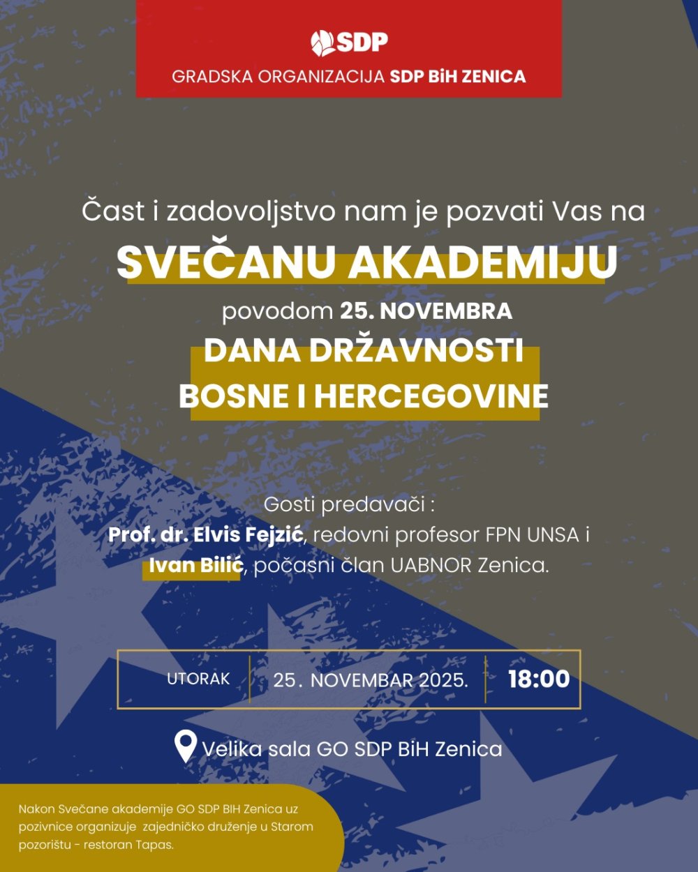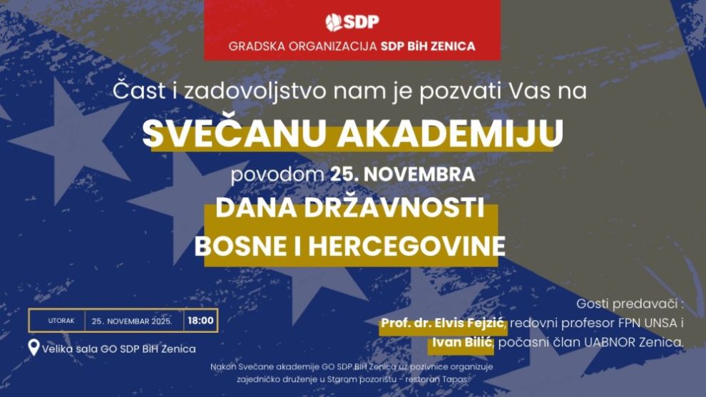 Gradska organizacija SDP BiH Zenica povodom 25. novembra Dana državnosti Bosne i Hercegovine organizuje SVEČANU AKADEMIJU, koja će se održati u utorak 25.11.2025. godine u 18 sati u Velikoj Sali GO SDP BiH Zenica, Ulica Masarikowa 48.