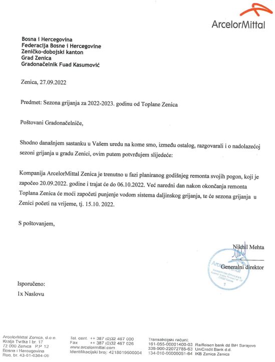 Također, kompanija ArcelorMittal Zenica je dana 27.09.2022. godine pismenim putem obavijestila Grad Zenica da će sezona grijanja u Zenici početi na vrijeme, tj. 15.10.2022. godine.