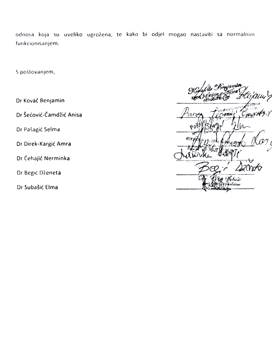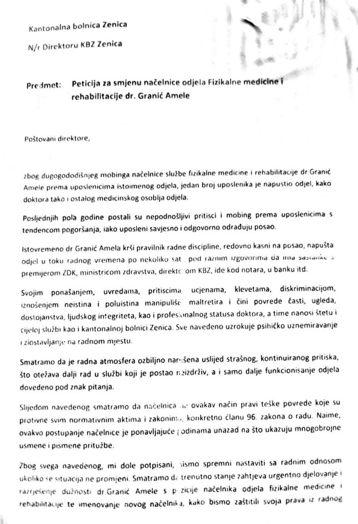 Saopćenje za javnost SDP Zenica: Iz KB Zenica dolaze zabrinjavajuće informacije- Čak 7 mladih ljekara – specijalista fizikalne medicine – najavilo je odlazak iz bolnice zbog mobinga i torture koje nad njima, prema više prijava, vrši načelnica Službe za fizikalnu medicinu dr. Amela Granić.