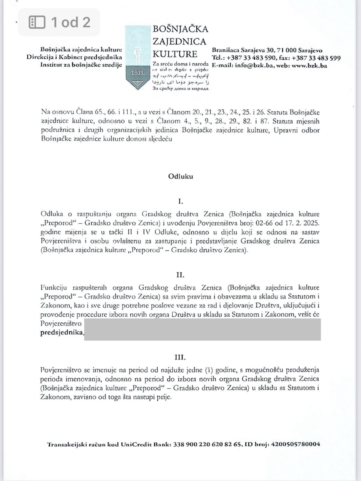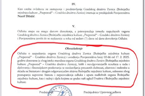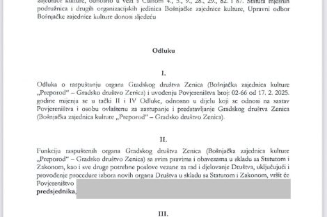 Članovi UO Bošnjačke zajednice kulture „Preporod“ Zenica, zaprimili su novu Odluku o raspuštanju zeničkog Preporoda i uvođenju povjereništva. Odluka je po drugi put donesena 06.03.2025. To je ujedno i drugi pokušaj da se UNIŠTI Preporod Zenica, a koji je dirigiran iz sarajevske centrale koja i dalje traga za klimoglavcima i poslušnicima u krovnoj bošnjačkoj instituciju kulture u Zenici. Šta je bilo sa prvom Odlukom o raspuštanju zeničkog Preporoda od 17.02.2025.?