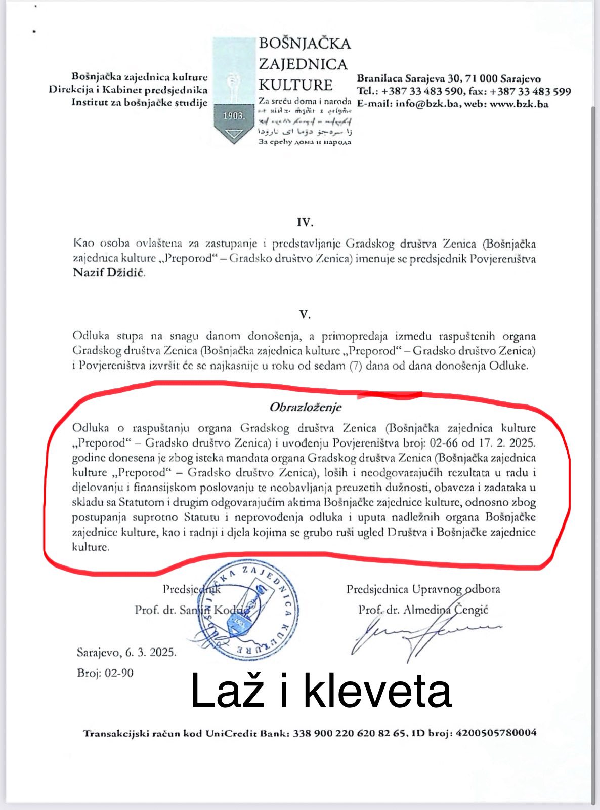 U vremenu kada se od institucija očekuje da budu čuvari kulture, istine, bošnjačke nacije i Domovine, svjedočimo još jednom primjeru kako se lični interesi stavljaju ispred principa i vrijednosti. Odluka o imenovanju povjereništva BZK „Preporod” Zenica donesena je pod obrazloženjem koje bi, da nije tragično, bilo smiješno – jer kad ponestane argumenata, preostaju laž i kleveta iza koje stoji rukovodstvo centrale BeZeKe iz Sarajeva! Javnost treba da zna da su svi navodi iz obrazloženja Olduke koju objavljujemo čista LAŽ!