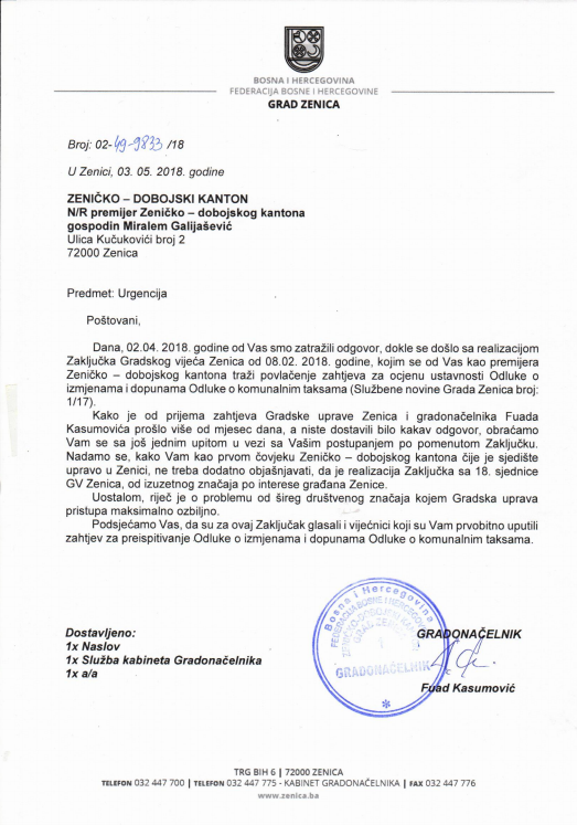 Saopćenje za medije – Urgencija Gradske uprave Zenica premijeru ZDK – Gradonačelnik Zenice Fuad Kasumović potpisao je danas urgenciju kojom u ime Gradske uprave i Gradskog vijeća Zenica od premijera Zeničko – dobojskog kantona Miralema Galijaševića traži informaciju o aktivnostima poduzetim po pitanju Zaključka Gradskog vijeća od 08. februara 2018. godine.
