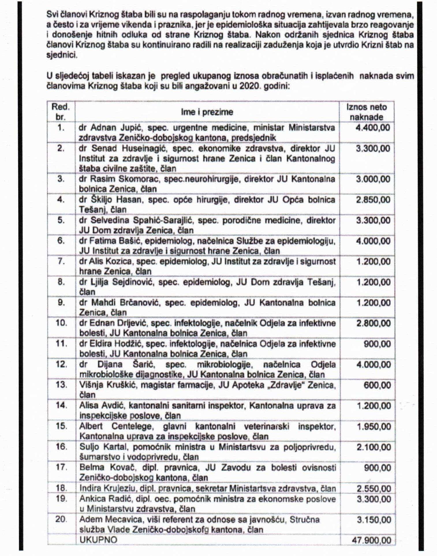 Poštovani građani Zenice i Zeničko – dobojsko kantona, dok su ljekari i medicinsko osoblje danonoćno vodili borbu za živote naših sugrađana, u nehumanim uslovima i bez opreme koju im nije nabavila SDA Vlada ZDK, članovi Kriznog štaba gurali su se pred kamere kao da su žrtve i humanitarci, te su za svoj (ne)rad su u 2020. godini naplatili sramnih 47.900 KM, a pojedinačne iznose naknada isplaćenih članovima Kriznog štaba pogledajte u prilogu.