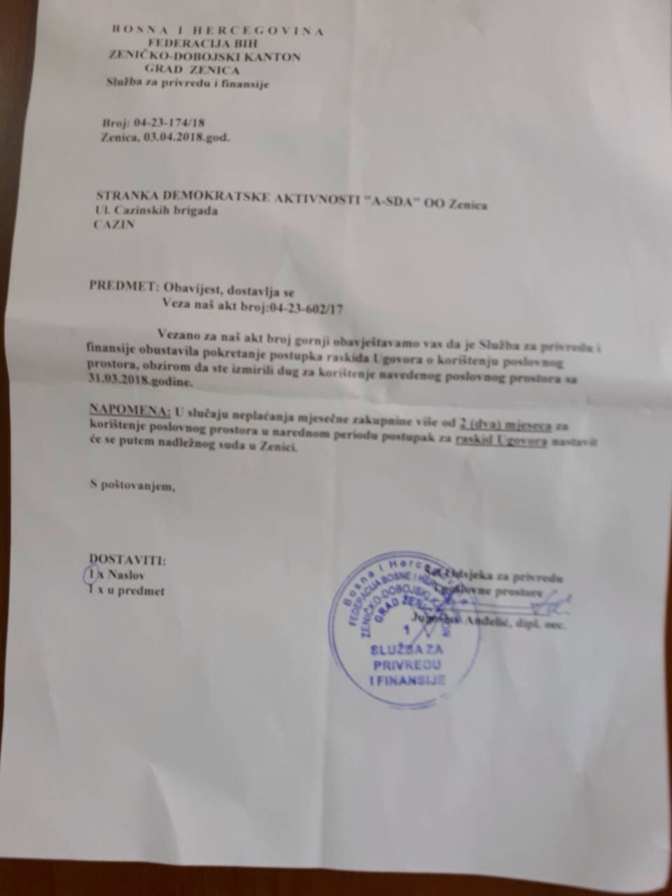 Saopštenje za javnost A-SDA Zenica – U posljednje vrijeme u javnost su zlonamjerno plasirane neistinite informacije o navodnom dugovanju Stranke demokratske aktivnosti A-SDA za korištenje iznajmljenog kancelarijskog prostora u Zenici.
