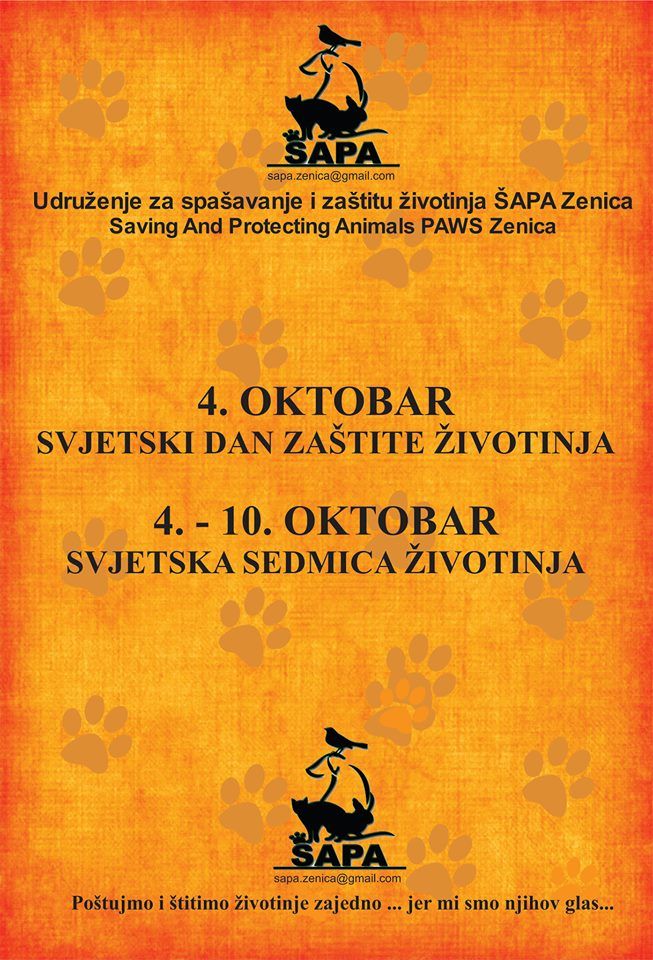 Udruženje ŠAPA Zenica u svjetskoj sedmici zaštite životinja apeluje na širu javnost, poziva škole i druge obrazovne institucije da se pridruže tako što će jedan školski sat posvetiti ovoj temi.  Udruženje ŠAPA Zenica i ovog 4. oktobra i ove sedmice svakodnevnim aktivnostima i volontiranjem pomaže životinjama i zajednici, provodeći aktivnosti spašavanja bolesnih, povređenih, napuštenih životinja, njihovog udomljavanja, te apeluje na građane i da u što većem broju posjete Gradsko sklonište za napuštene pse u Stranjanima u Zenici i udome napuštenu životinju.