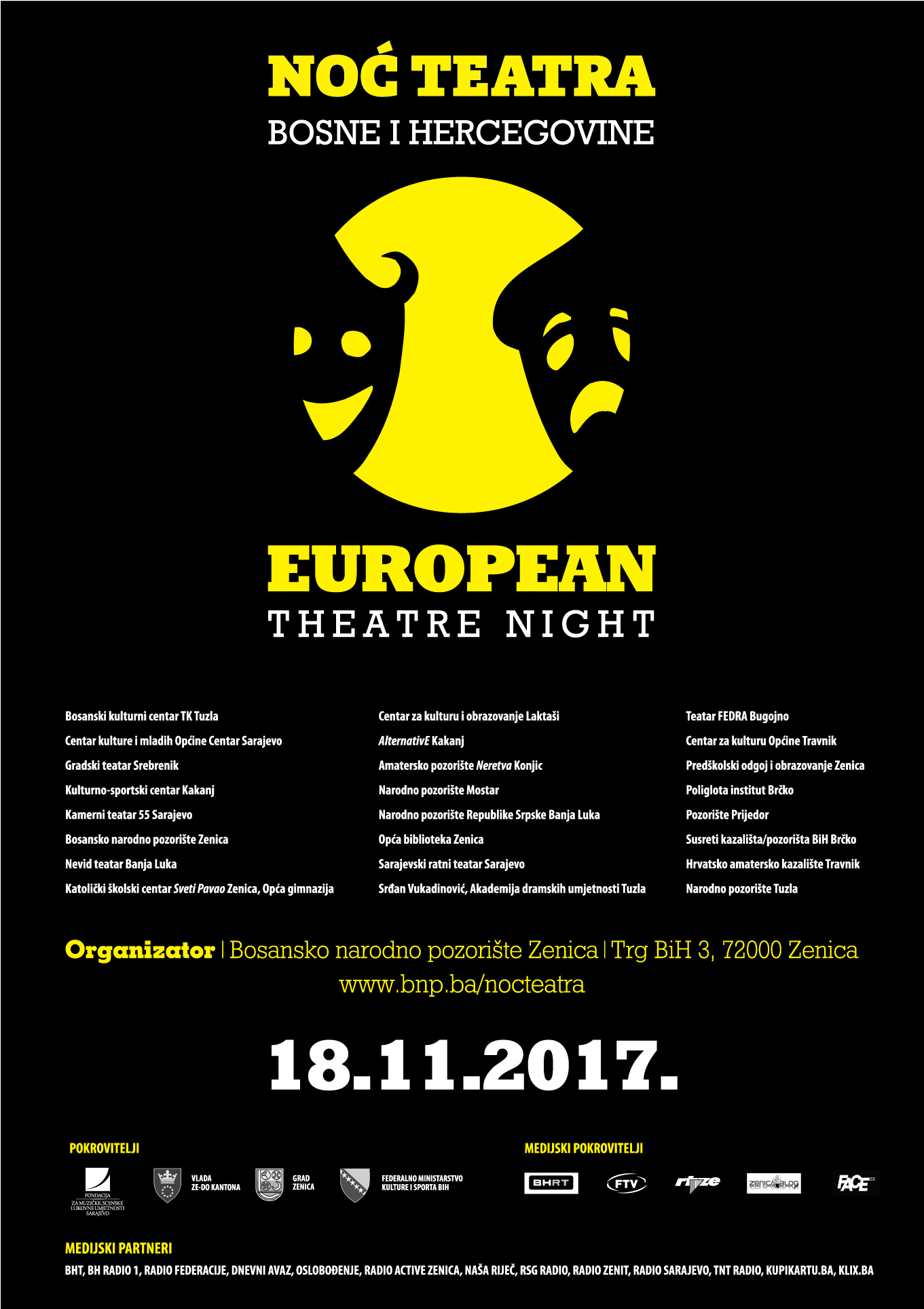Kako je izjavila koordinatorica Noći teatra Merima Handanović, ova manifestacija se održava deseti put u Evropi, a osmi put u Bosni i Hercegovini pod koordinacijom Bosanskog narodnog pozorišta Zenica. Cilj Noći teatra je da se otvore vrata teatara i teatarskih ustanova, te se time približi svima koji su zainteresirani da upoznaju rad i djelovanje izvedbeno-scenskih umjetnosti. Kako je naglasila Handanović, i ove godine je većina sadržaja sa besplatnim ulazom, a tek neki sadržaji zbog složenosti svoje realizacije su dostupni po vrlo povoljnim cijenama. Također, istakla je da ove godine osam zemalja širom Evrope obilježava Noć teatra i otvara vrata svojih teatara. Dramaturginja Dubravka Zrnčić-Kulenović je istakla da je u Sarajevskom ratnom teatru cijela sedmica posvećena Noći teatra, te da SARTR već godinama s radošću prihvata poziv ove manifestacije vodeći se idejom da ovakvim projektima pružamo priliku da se pozorište upozna iz druge vizure.