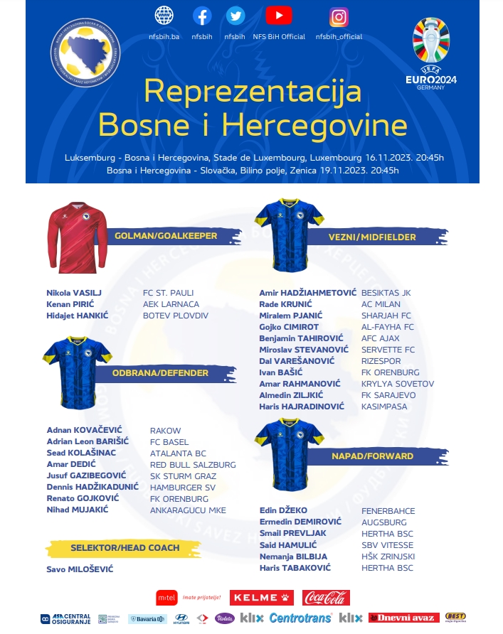 „A“ reprezentacija Bosne i Hercegovine će naredne utakmice u kvalifikacijama za EURO 2024. odigrati sa Luksemburgom i Slovačkom 16. i 19. novembra.