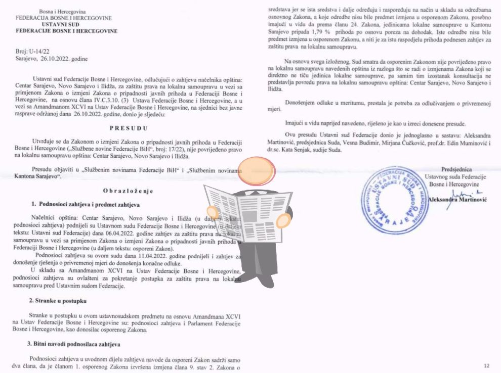Kako saznaje Zenicablog, Ustavni sud Federacije je donio Presudu, kojom je utvrđeno da Zakonom o izmjeni Zakona o pripadnosti javnih prihoda u Federaciji Bosne i Hercegovine NIJE POVRIJEĐENO PRAVO na lokalnu samoupravu opština Centar Sarajevo, Novo Sarajevo i Ilidža.