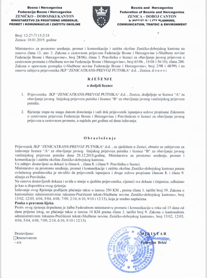 Izdavalac licence je resorno kantonalno ministarstvo, a Zenicablog ekskluzivno donosi kopiju rješenja kojim je konačno ozvaničen rad ovog autoprijevozničkog preduzeća sa 170 radnika.