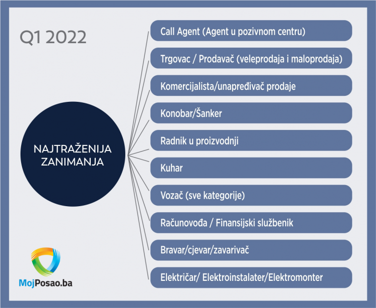 U prvom kvartalu 2022. godine na portalu MojPosao.ba objavljeno je više od 3.700 oglasa za posao i preko 8.600 radnih mjesta, što predstavlja znatan porast u odnosu na isti period prošle godine. Ako se ovi podaci uporede sa istim periodom 2020. i 2019. godine, zaključuje se da se tržište rada oporavilo i da se potražnja za radnicima vratila na pretpandemijski nivo.