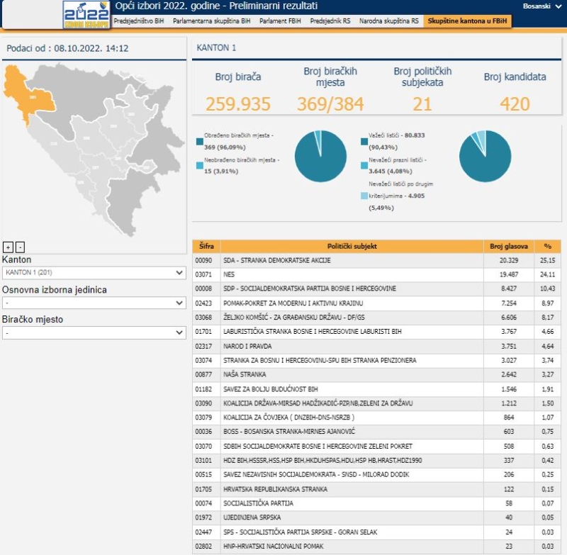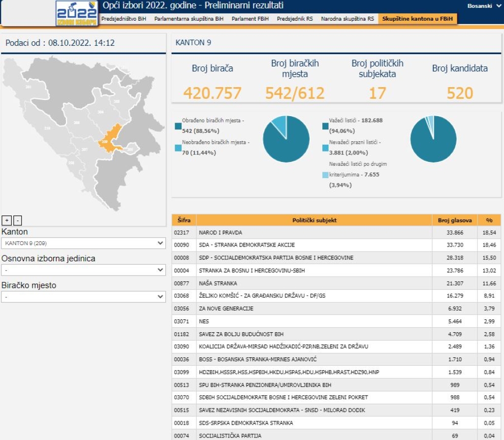 Centralna izborna komisija (CIK) Bosne i Hercegovine ažurirala je podatke preliminarnih rezultata Općih izbora održanih 2. oktobra ove godine.