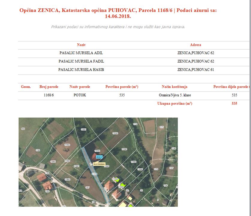 Iz javnih podataka Federalne geodetske uprave se jasno vidi da se radi o privatnoj parceli u k.o. Zenica, k.č. Puhovac, broj parcele 1168/6.