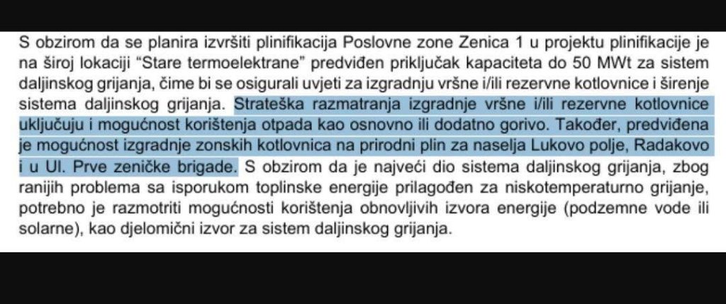 Urbanistički plan Grada Zenice, koji će se danas naći na dnevnom redu Gradskog vijeća, na mala vrata uvodi i mogućnost izgradnje spalionice komunalnog otpada u krugu Nove Željezare Zenica. “Vršna i/ili rezervna kotlovnica”, koja se na više mjesta spominje u ovom dokumentu, uključuje i mogućnost korištenja otpada kao osnovno ili dodatno gorivo!