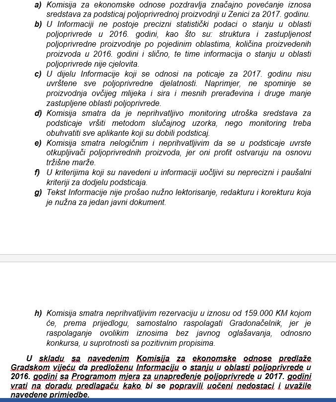 Zbog mnoštva manjkavosti koje su uočene od strane Komisije za ekonomske odnose Radno predsjedništvo prošireno predsjednicima klubova političkih stranaka je jednoglasno zauzelo stav da se navedeni dokumenti skinu sa dnevnog reda spomenute osme sjednice zbog ozbiljnih nedostataka. Zbog građana Zenice u ovom saopćenju iznosimo samo dio uočenih manjkavosti: nije predviđena potpuna i transparentna kontrola utroška sredstava, poticaj trebaju dobiti i otkupljivači iako oni posluju na bazi tržišne marže, utvrđeni kriteriji lahko mogu dovesti do zloupotreba, a vrhunac ovog lošeg dokumenta je rezervacija 159.000 konvertibilnih maraka kojima će samostalno, bez bilo kakvog konkursa, to jest protuzakonito, raspolagati gradonačelnik Fuad Kasumović.