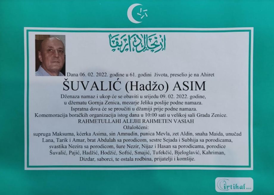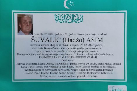 SDA Zenice izražava iskreno saučešće porodici i prijateljima rahmetli Asima Šuvalića, moleći Svevišnjeg da mu podari lijepi Džennet i vječnih rahmet.