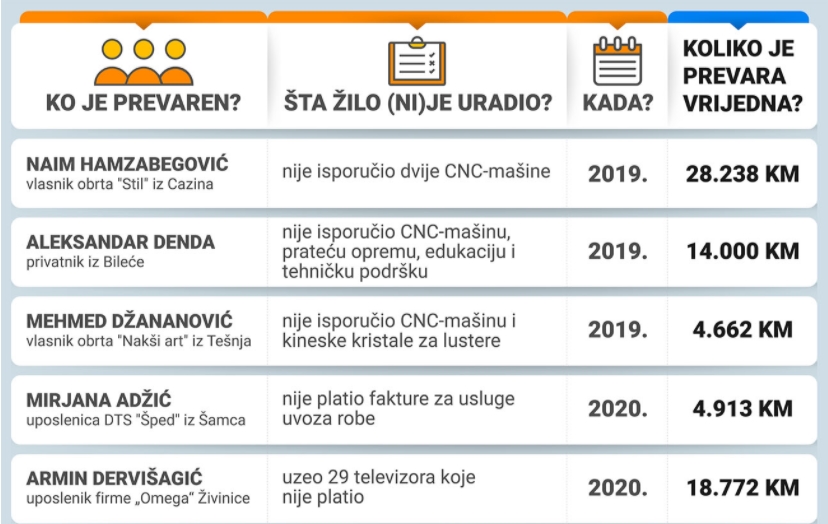 Centar za istraživačko novinarstvo je krajem decembra prošle godine objavio priču o višestruko osuđivanom Seadu Žili koji zbog prevara i utaja ima najmanje osam presuda u Bosni i Hercegovini i Hrvatskoj. Oštetio je pojedince i firme za nešto više od 260.000 KM, uglavnom im nudeći usluge i robu koju nikada nije isporučio.